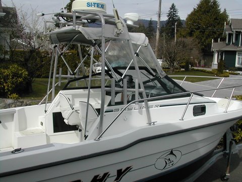 controlled spotlight, rod holders, aft deck light, VHF, CD stereo, full canvas, porta-potti, washdown pump, baitwell, fish lockers, anchor,